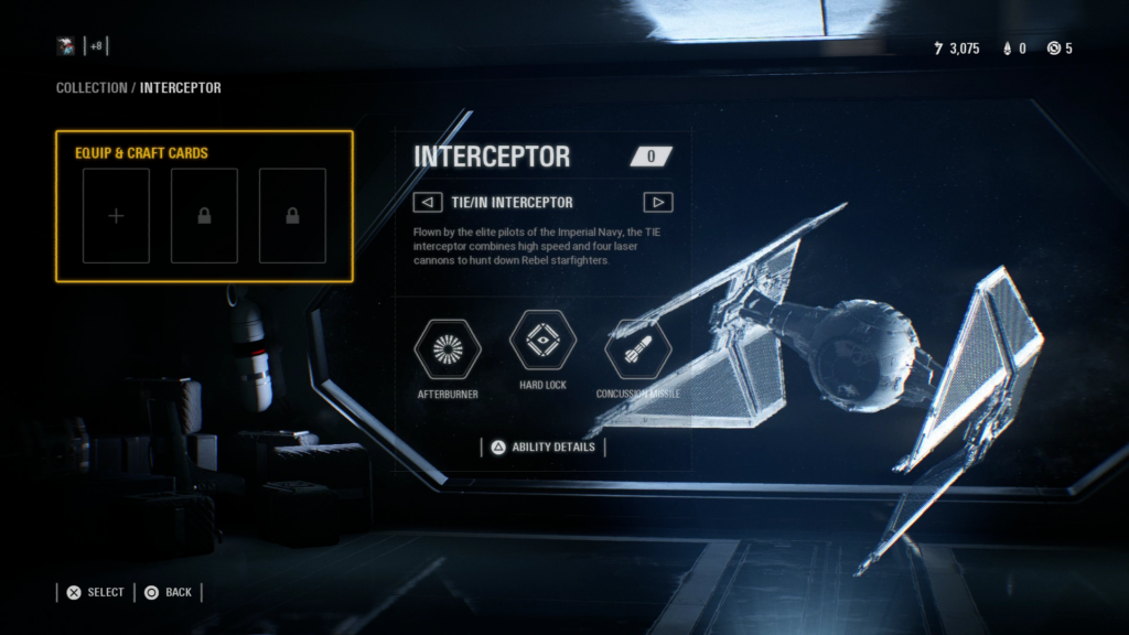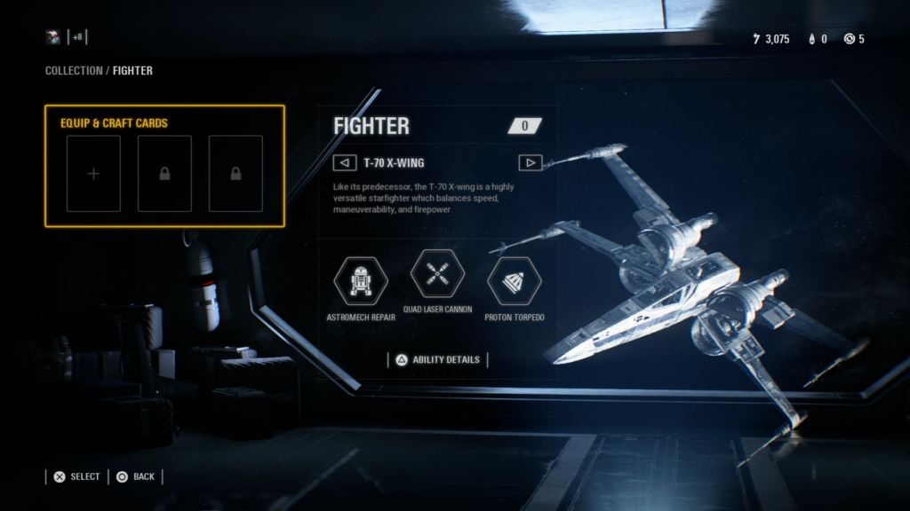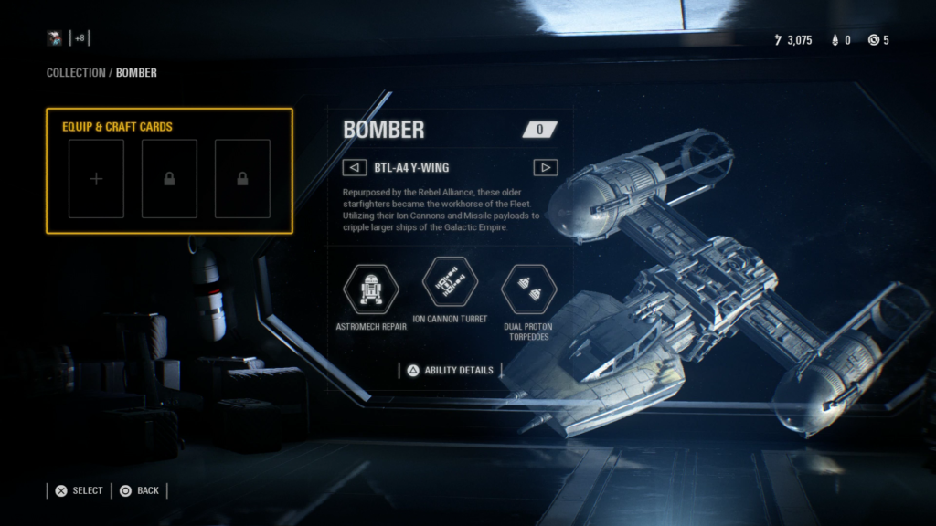Below you can see some of the loadouts for the starfighters in the game. Each starfighter has 3 abilities. Generally, the left-hand ability is defensive, the right-hand ability is offensive, and the middle ability is something unique to that fighter and more powerful.